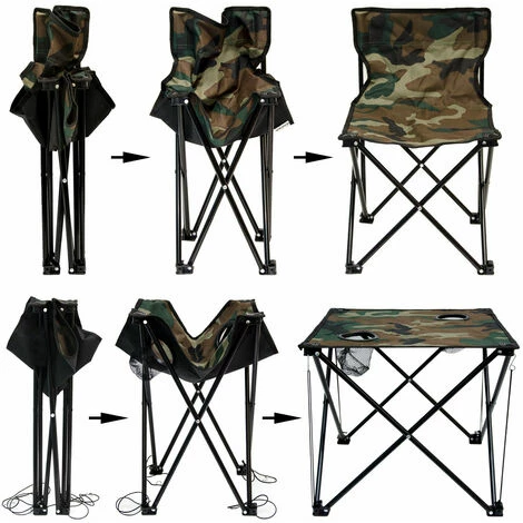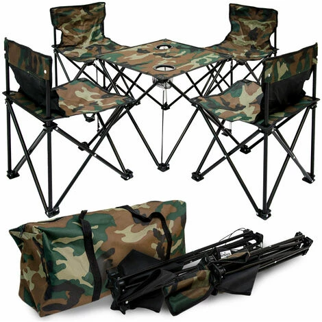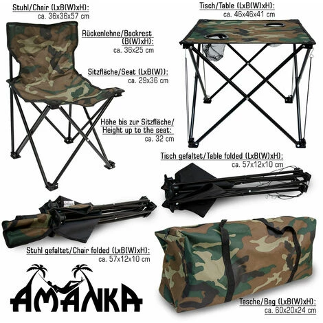 Das praktische Campingtischset von AMANKA in der trendigen Tarnfarbe kann überall für jegliche Aktivitäten im Freien eingesetzt werden. Beim Campen, Angeln, Zelten, Wandern, Reisen ist der kompakte Falttisch und 4 robuste Klapphocker unersetzlich.
