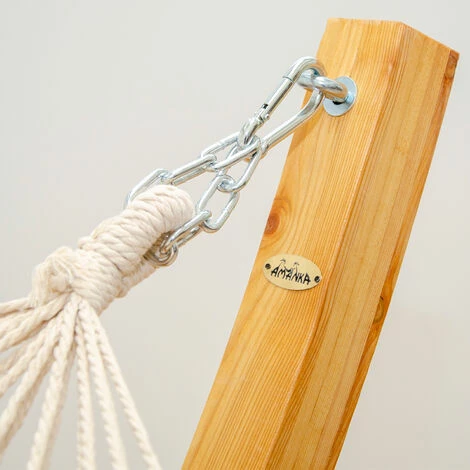 Sie können selbst bestimmen, wie hoch Sie liegen möchten, indem Sie die Matte etwas strammer oder etwas lockerer spannen. Die Kette inklusive dem Karabiner macht es möglich. Die gebogenen Holzstreben werden in der Mitte 2-fach “eingerahmt” und mit insgesamt je zwei Schrauben stabil gesichert. Die Füße werden ebenfalls 2-fach verschraubt, so dass ein sicherer Stand garantiert wird.