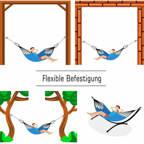 – Zur Anbringung zwischen Bäumen, Balken oder zwei Wänden; geeignet für Holz und Beton.