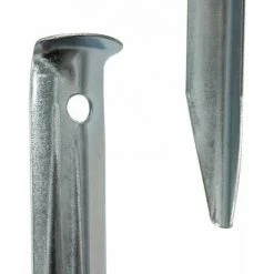 UND DIE ABSPANNLEINE HÄLT – Der Haken am oberen Ende verhindert, dass die Spannleine vom Erdnagel abrutscht. Zeltnagel wieder entfernen? Mit dem Loch für den Heringzieher wird Abbau zum Kinderspiel. Verzinkter Stahl-Zelthering, ca. 230x20x1 mm groß.