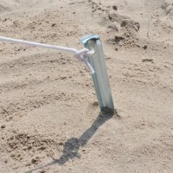 Unten ist der Zelt-Haken angeschrägt, Sie versenken ihn damit ganz einfach im Untergrund. Bei etwas härterem Boden können Sie es auch mit einem Camping-Hammer versuchen.