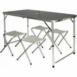 LEICHTER WIRD’S NICHT: Das komplette Tischset aus Aluminium wiegt nur 7,5 kg! Es enthält 4 Klapphocker und einen faltbaren Tisch – in 3 Stufen höhenverstellbar. Pflicht für jedes Wohnmobil, denn als Camper sparen Sie damit immens an Ihrer Zuladung